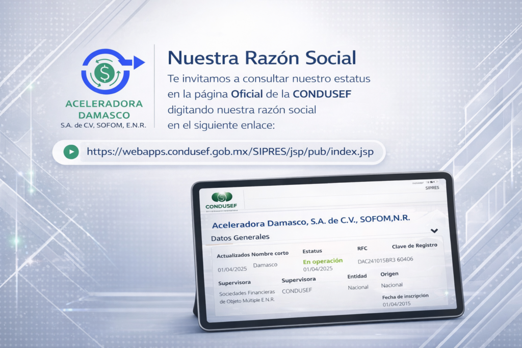En Aceleradora Damasco trabajamos para ofrecerte una tasa competitiva y condiciones claras, pensadas para que avances con tranquilidad y sin complicaciones.